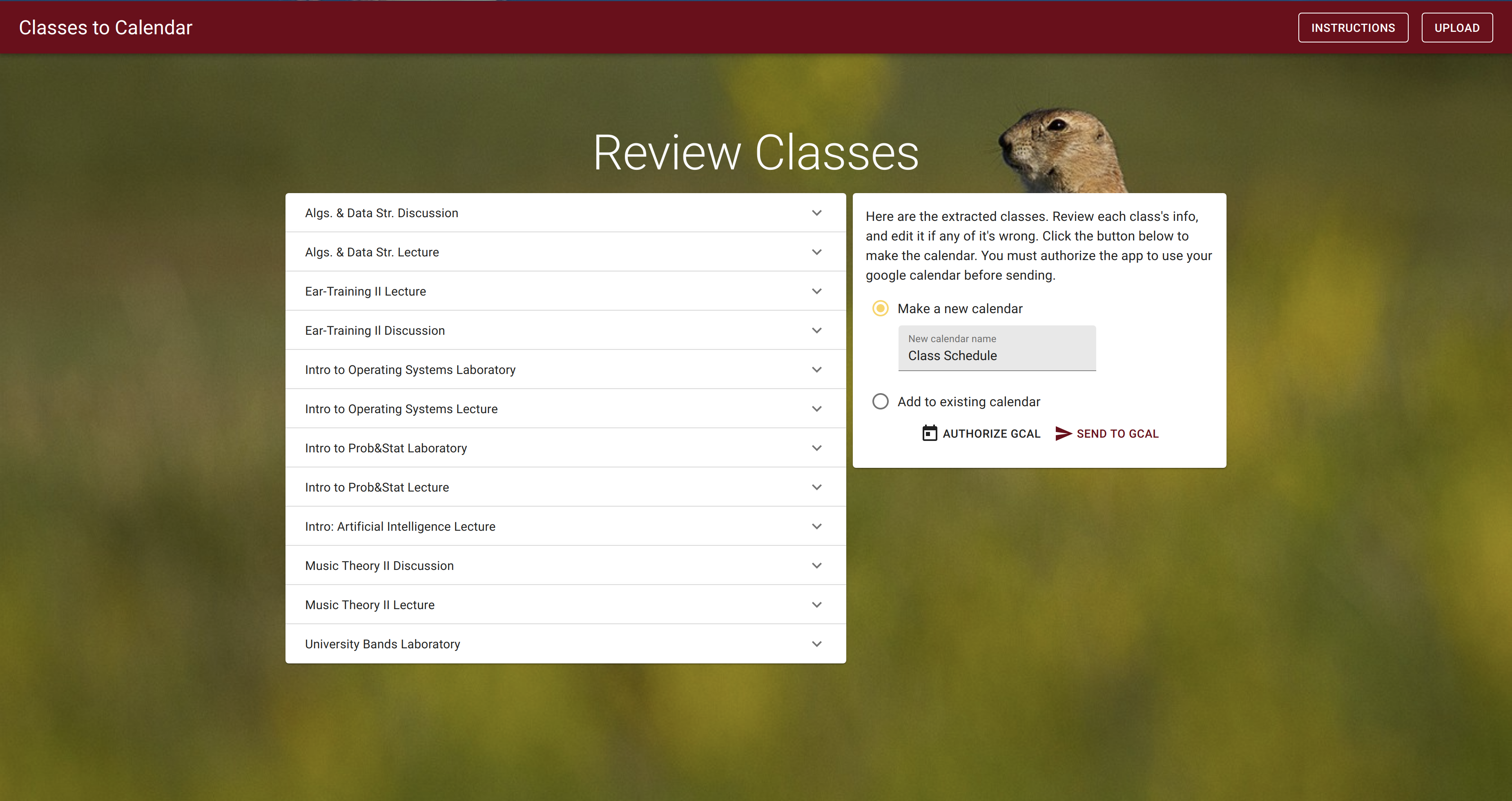 This is a web application designed to take an image of a UMN class schedule and extract the class data out of it. It uses Google's Tesseract OCR to parse the text from the image into a calendar event. The user can then add these classes to their Google Calendar on either a new calendar or an already existing one. In the future, this will hopefully be able to work not just for UMN classes, but for any class schedule using NLP. It is a React App with a Flask backend API. The demo website can be found here.